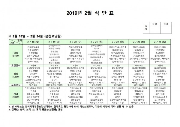 2월 셋째주 식단표 페이지 정보 작성자 은천노인복지회 작성일19-02-28 15:44 조회203,459회 댓글0건 관련링크 이전글 다음글 목록 답변 본문 2월 셋째주 식단표 이전글 다음글 목록 답변