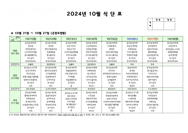 10월 넷째주 식단표 페이지 정보 작성자 은천노인복지회 작성일24-10-18 10:37 조회18,319회 댓글0건 관련링크 이전글 다음글 목록 답변 본문 . 이전글 다음글 목록 답변