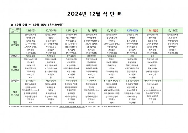12월 둘째주 식단표 페이지 정보 작성자 은천노인복지회 작성일24-12-06 09:42 조회17,192회 댓글0건 관련링크 이전글 다음글 목록 답변 본문 . 이전글 다음글 목록 답변