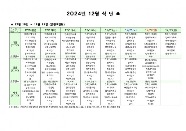 12월 셋째주 식단표 페이지 정보 작성자 은천노인복지회 작성일24-12-13 09:36 조회16,511회 댓글0건 관련링크 이전글 다음글 목록 답변 본문 . 이전글 다음글 목록 답변