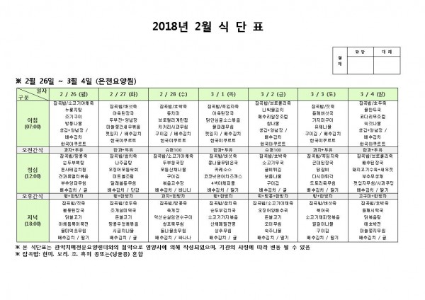 3월 첫째주 식단표 페이지 정보 작성자 은천노인복지회 작성일18-02-27 16:10 조회193,599회 댓글0건 관련링크 이전글 다음글 목록 답변 본문 3월 첫째주 식단표 이전글 다음글 목록 답변