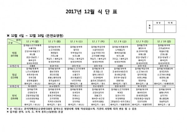 12월 둘째주 식단표 페이지 정보 작성자 은천노인복지회 작성일17-12-04 13:47 조회186,503회 댓글0건 관련링크 이전글 다음글 목록 답변 본문 12월 둘째주 식단표 이전글 다음글 목록 답변