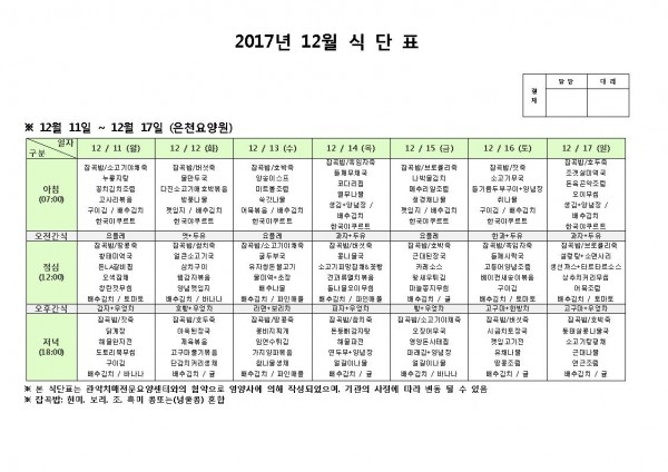 12월 셋째주 식단표 페이지 정보 작성자 은천노인복지회 작성일17-12-11 10:18 조회186,880회 댓글0건 관련링크 이전글 다음글 목록 답변 본문 12월 셋째주 식단표 이전글 다음글 목록 답변