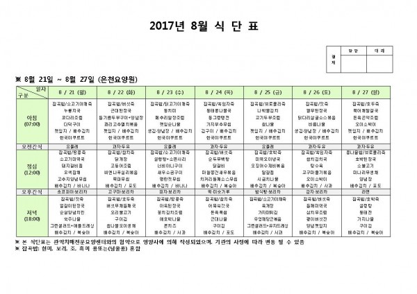 8월 넷째주 식단표 페이지 정보 작성자 은천노인복지회 작성일17-08-21 10:51 조회178,655회 댓글0건 관련링크 이전글 다음글 목록 답변 본문 8월 넷째주 식단표 이전글 다음글 목록 답변