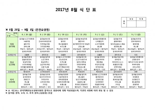 8월 다섯째주식단표 페이지 정보 작성자 은천노인복지회 작성일17-08-28 14:38 조회180,039회 댓글0건 관련링크 이전글 다음글 목록 답변 본문 8월 다섯째주식단표 이전글 다음글 목록 답변