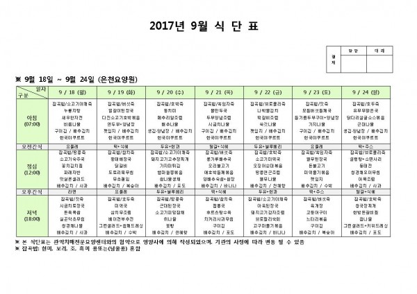 9월 셋째주 식단표 페이지 정보 작성자 은천노인복지회 작성일17-09-18 11:02 조회181,566회 댓글0건 관련링크 이전글 다음글 목록 답변 본문 9월 셋째주 식단표 이전글 다음글 목록 답변