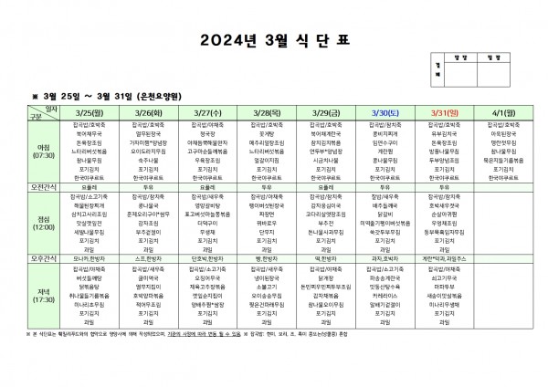 3월 다섯째주 식단표 페이지 정보 작성자 은천노인복지회 작성일24-03-22 10:02 조회26,479회 댓글0건 관련링크 이전글 다음글 목록 답변 본문 . 이전글 다음글 목록 답변
