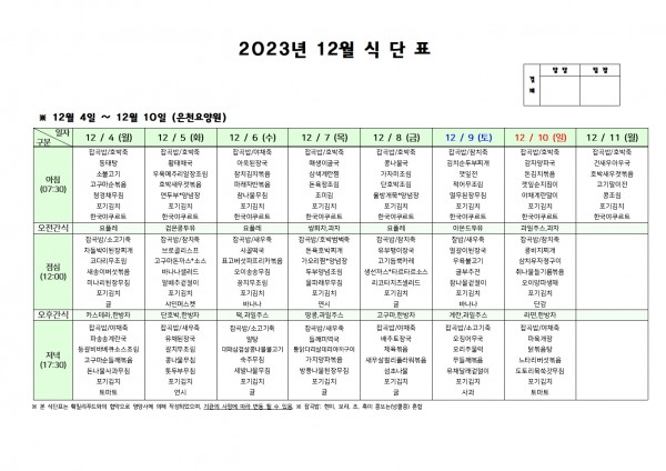 12월 둘째주 식단표 페이지 정보 작성자 은천노인복지회 작성일23-12-01 16:35 조회31,454회 댓글0건 관련링크 이전글 다음글 목록 답변 본문 . 이전글 다음글 목록 답변