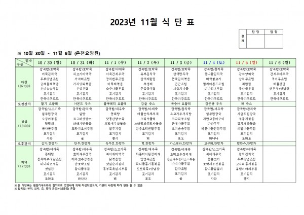 11월 첫째주 식단표 페이지 정보 작성자 은천노인복지회 작성일23-10-26 13:39 조회35,184회 댓글0건 관련링크 이전글 다음글 목록 답변 본문 . 이전글 다음글 목록 답변