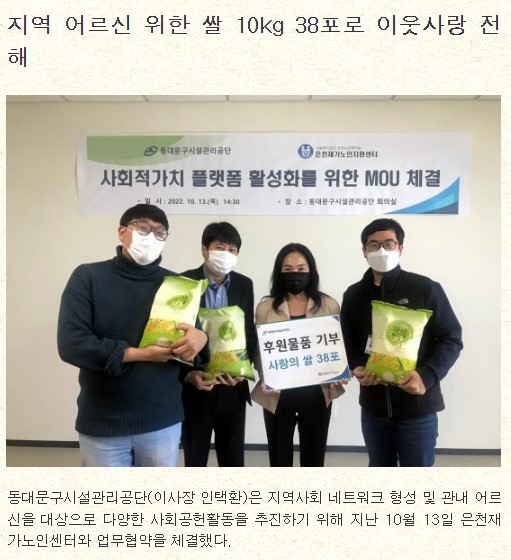은천재가노인지원센터와 시설관리공단의 협약체결 페이지 정보 작성자 은천노인복지회 작성일22-11-09 16:58 조회8,508회 댓글0건 관련링크 https://blog.naver.com/news500/222901633880 4554회 연결 목록 답변 본문 동대문시설관리공단과 은천재가노인지원센터와 협약을 체결하였습니다앞으로 상호 협조하여 어르신의 행복한 노후를 위하여 계속 노력하겠습니다. 목록 답변