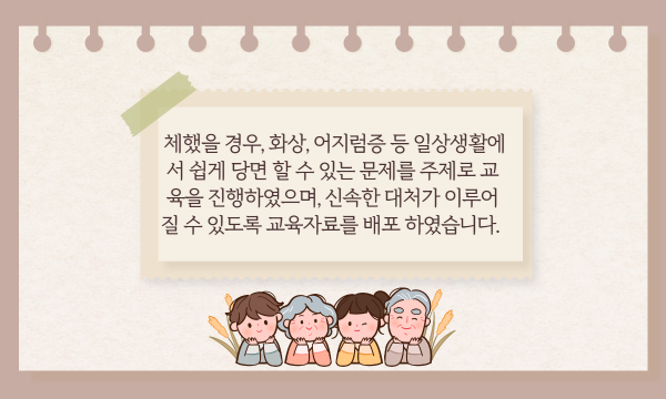 [재가노인서비스] 대상자교육_응급처치교육 페이지 정보 작성자 은천노인복지회 작성일22-03-03 11:43 조회18,875회 댓글0건 관련링크 이전글 다음글 목록 답변 본문 은천재가노인지원센터 대상자 어르신들에게 응급처치교육을 진행하였습니다. 이전글 다음글 목록 답변