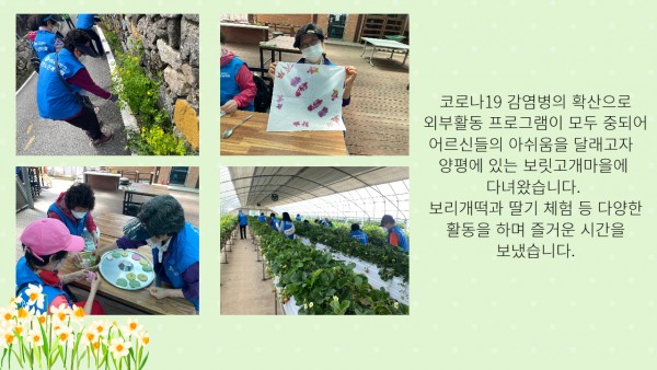 [재가노인지원] 봄 나들이 페이지 정보 작성자 은천노인복지회 작성일22-06-03 17:15 조회17,987회 댓글0건 관련링크 이전글 다음글 목록 답변 본문 재가노인지원센터 어르신들과 양평 보릿고개마을로 나들이를 다녀왔습니다. 이전글 다음글 목록 답변