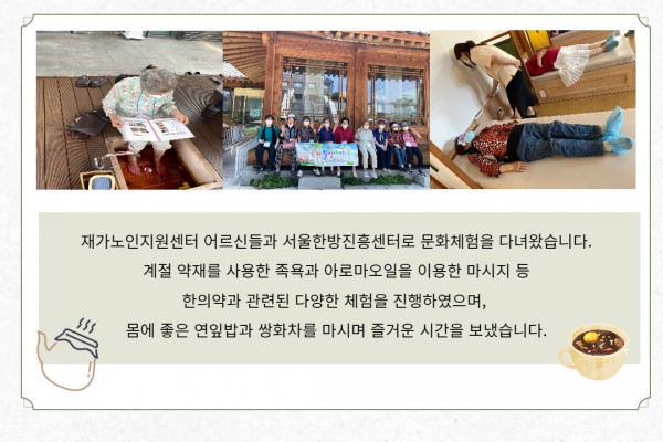 [재가노인지원] 문화공연관람서비스 '문화 힐링데이' 페이지 정보 작성자 은천노인복지회 작성일22-06-03 17:19 조회17,654회 댓글0건 관련링크 이전글 다음글 목록 답변 본문 2022년 상반기 문화활동으로 서울한방진흥센터에 다녀왔습니다. 이전글 다음글 목록 답변