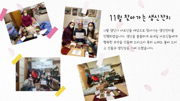 [재가노인지원서비스] 11월 찾아가는 생신잔치 페이지 정보 작성자 은천노인복지회 작성일21-12-15 17:21 조회19,749회 댓글0건 관련링크 이전글 다음글 목록 답변 본문 11월 찾아가는 생신잔치 이전글 다음글 목록 답변